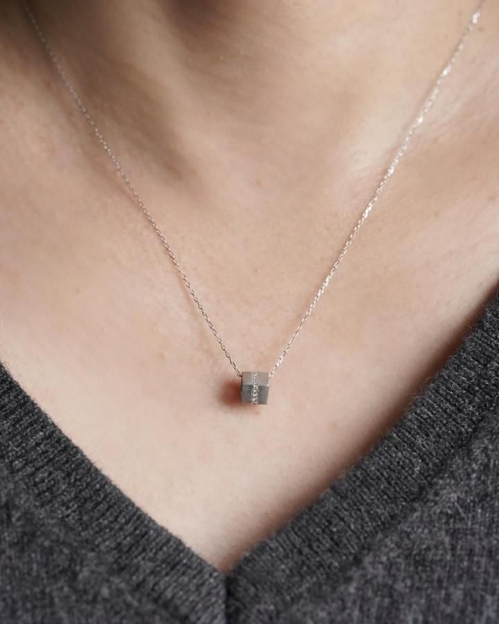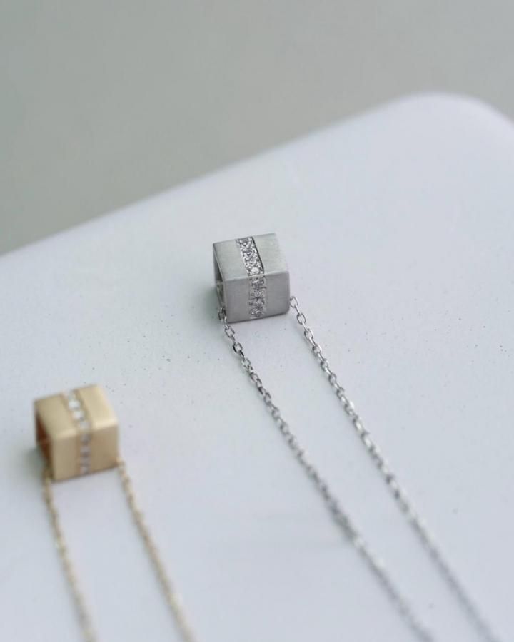 キューブ型の地金に、職人が一つひとつ手作業で丁寧に施したダイヤの彫留め。